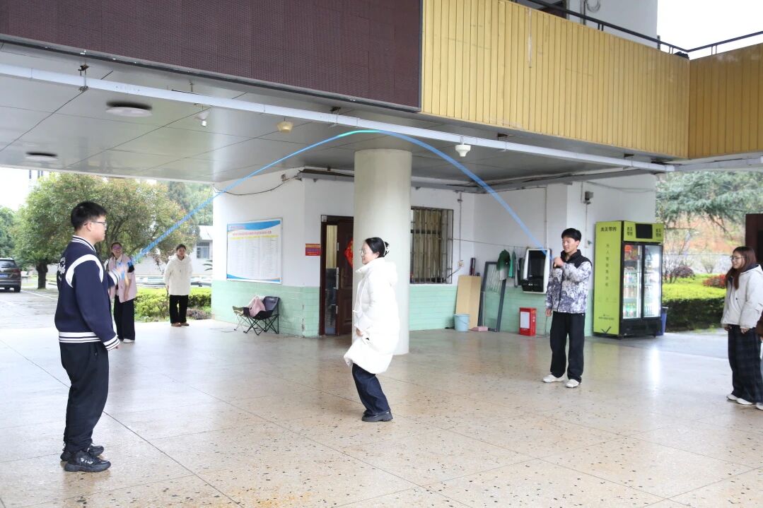 跳大绳:蓝色长绳在同学手中翻飞,大家依次跃入绳间,轻盈跳跃、默契配合,绳影间满是青春跃动的节奏;