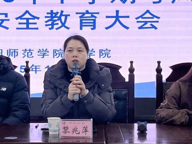 黎兆萍阐述了诚信应考的重要意义,并就近期学生管理工作进行总结。她指出,部分同学时间观念与纪律意识有待加强,强调遵守纪律与个人发展息息相关。针对期末考试与寒假安排,她提出四点要求:一是端正思想,合理规划复习,严肃考场纪律,诚信考试;二是认真负责,遵守学校纪律,配合学校做好校园环境建设与电动车整治工作;三是积极参加社会实践,做好职业发展规划。四是谨防电信诈骗,注意人身财产安全。