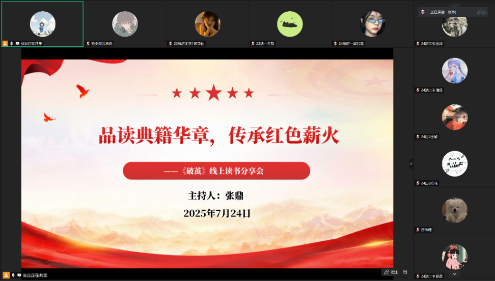 7月24日晚上19:30,我院学生党支部于腾讯会议开展此次“品读典籍华章 传承红色薪火”线上读书分享会。此次活动由第71期部分入党积极分子参加,张鼎担任主持人。