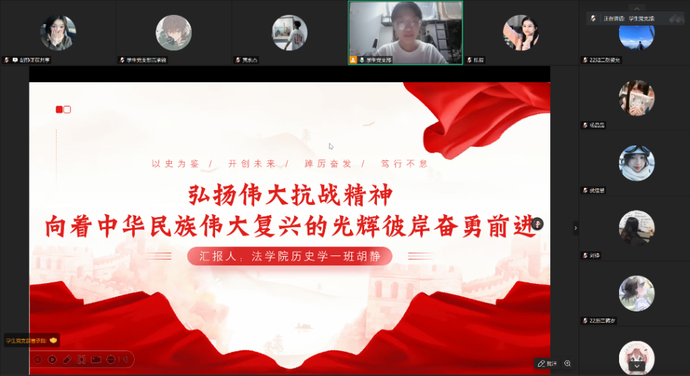 9月28日晚上19:30,我院学生党支部开展“弘扬伟大抗战精神,向着中华民族伟大复兴的光辉彼岸奋勇前进”线上主题党课。本次党课全体学生党员参加,由我院学生党员胡静讲授党课,2023级历史学3班曾玮晴主持。