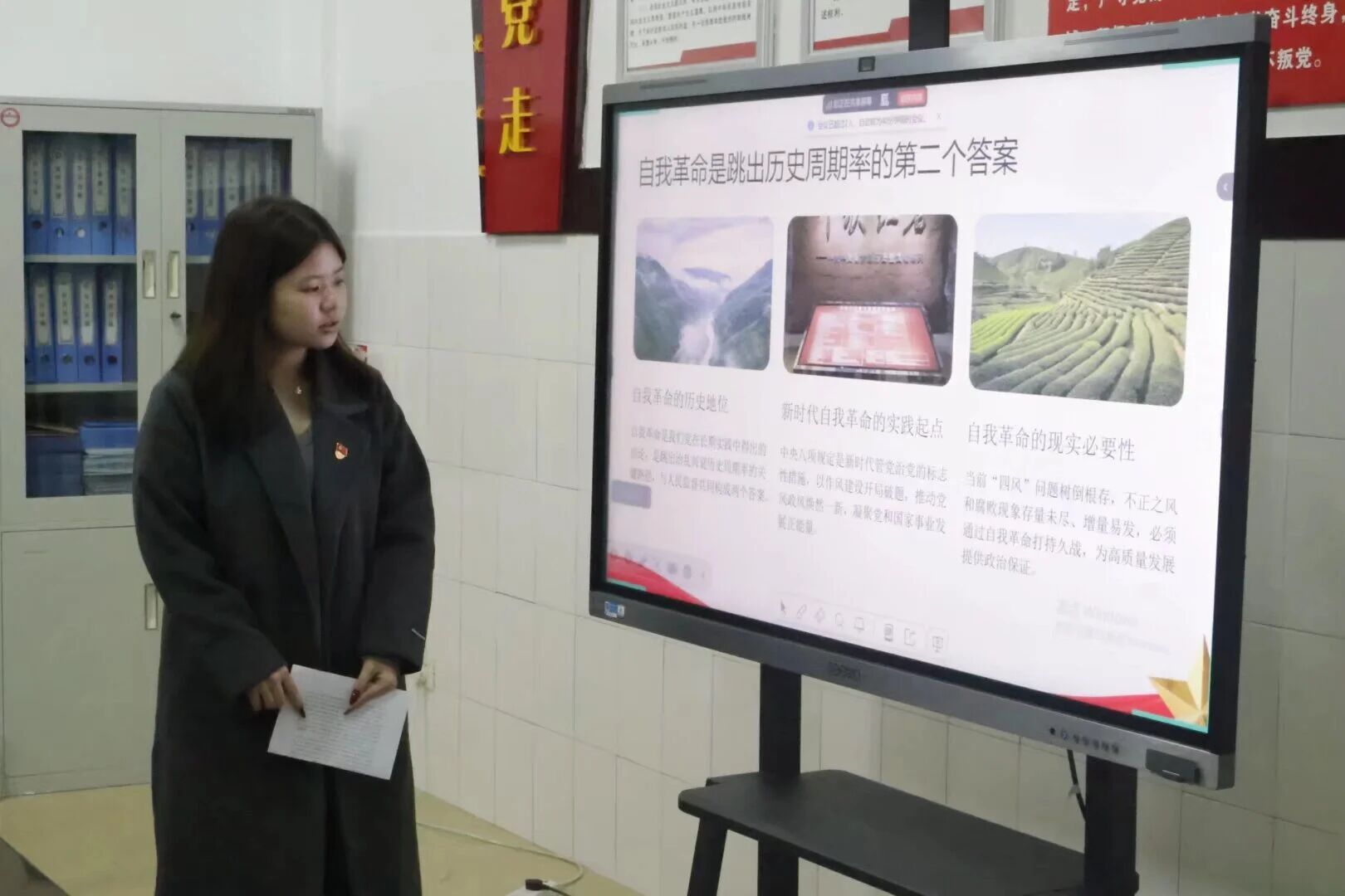 党课开篇,武佳慧围绕党的自我革命的重大意义展开阐释,强调自我革命是我们党跳出治乱兴衰历史周期率的第二个答案,与人民监督相辅相成,是新时代管党治党从宽松软走向严紧硬的关键路径。然后,她从“深刻把握党的自我革命的重大意义”、“推进党的自我革命要做到五个进一步到位”、“学生党员如何践行党的自我革命要求”、“总结与展望:以自我革命精神奋进新征程”四个方面进行具体讲解。