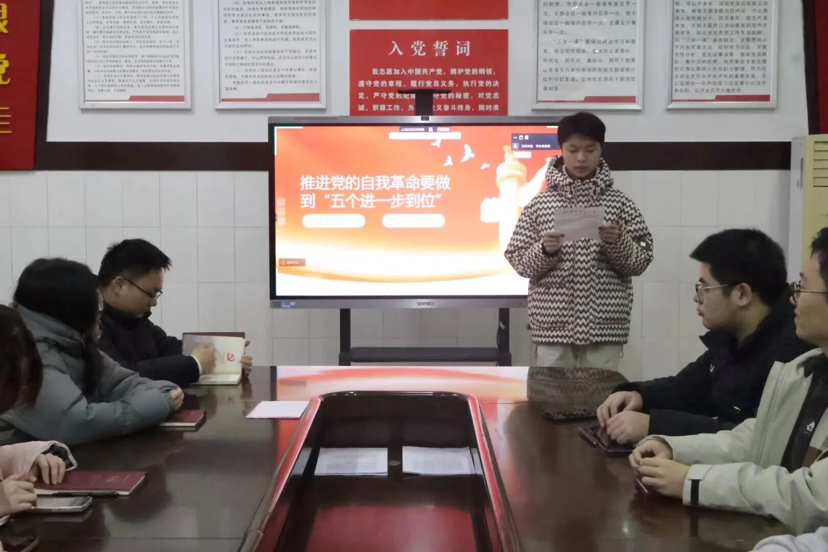 12月23日晚19:30,我院学生党支部于仁智楼B407开展“推进党的自我革命要做到‘五个进一步到位’”主题党课。本次党课采用线上腾讯会议与线下会场同步进行的方式,全体学生党员参与学习,我院学生党员武佳慧担任主讲人,2025级历史学二班刘孟姣主持。